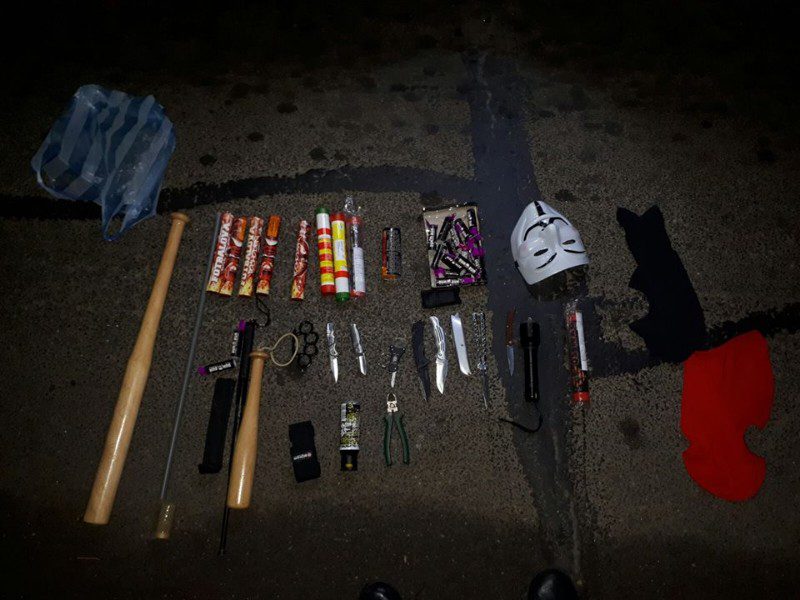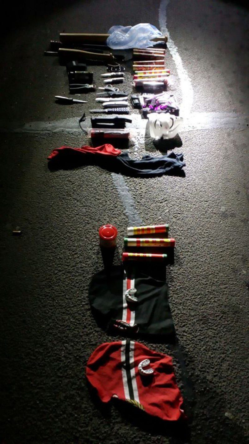 În urma acestui control, au fost găsite abandonate diferite bunuri, materiale pirotehnice şi arme albe: 2 bâte de baseball, baston telescopic, lanternă cu electroşocuri, pulverizator cu substanţe iritant-lacrimogene, un box de metal, 10 cuţite şi pumnale de diferite modele, mai multe petarde de diferite dimensiuni şi două fumigene, cagule şi o mască.