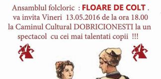 Vineri 13 mai,începând cu ora 18:00 va avea loc un spectacol cu cei mai talentați copii ai ansamblului "FLOARE DE COLȚ".