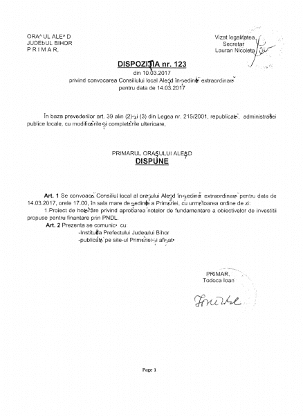 DISPOZIŢIA NR.123 DIN 10.03.2017 PRIVIND CONVOCAREA CONSILIULUI LOCAL ALEŞD ÎN ŞEDINŢĂ EXTRAORDINARĂ PENTRU DATA DE 14.03.2017