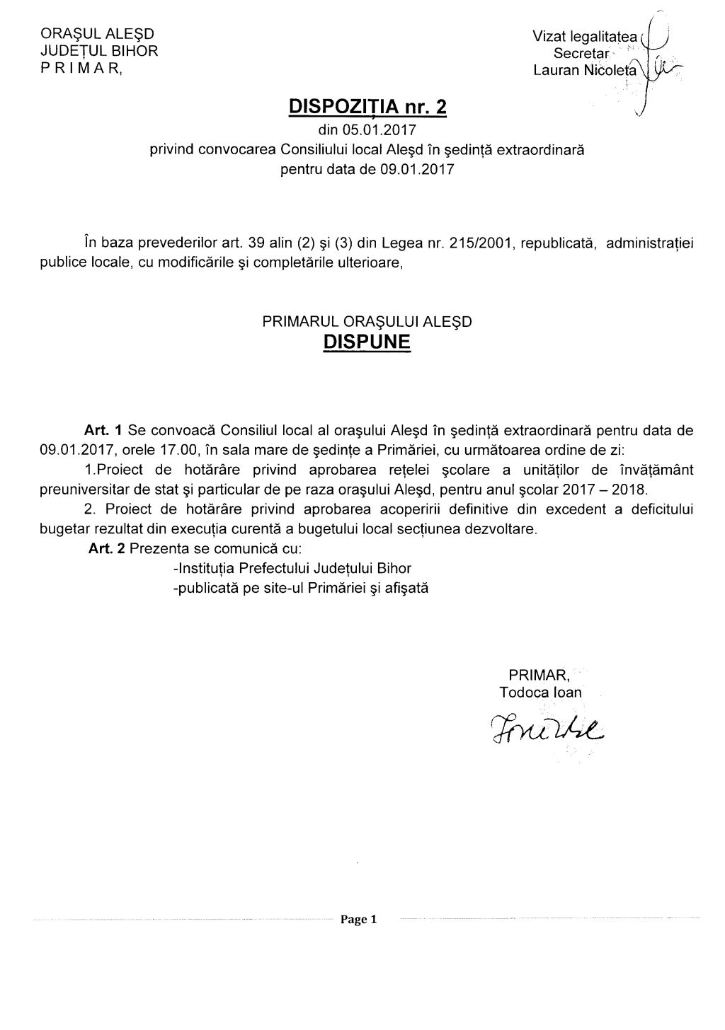 DISPOZIŢIA nr. 2 din 05.01.2017 privind convocarea Consiliului local Aleşd în şedinţă extraordinară pentru data de 09.01.2017