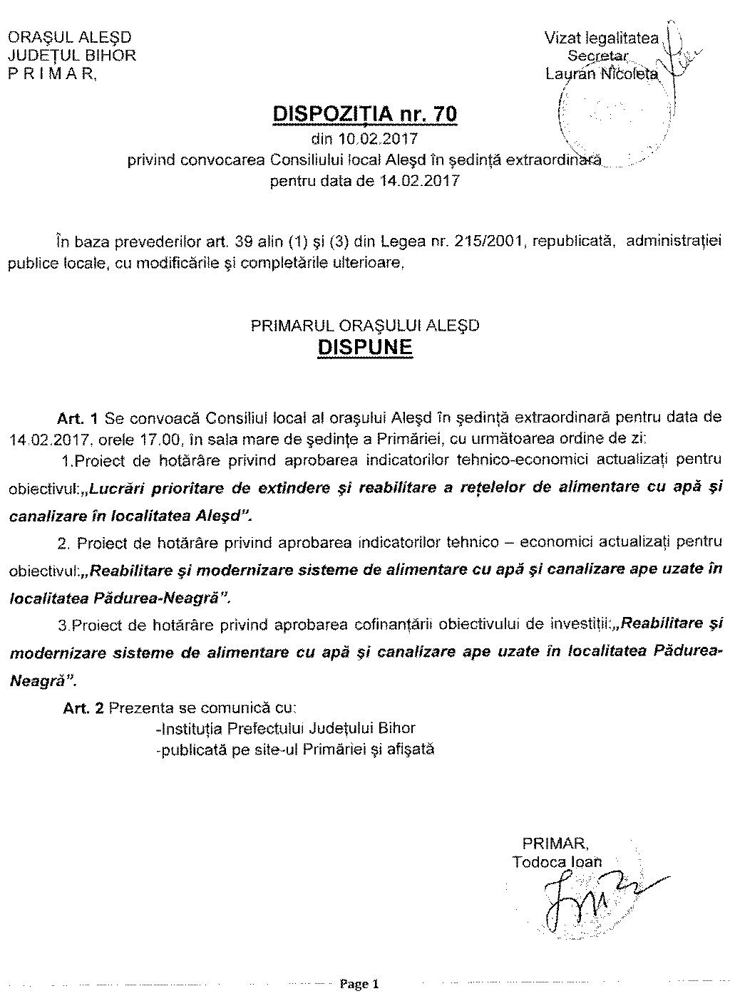 Art. 1 Se convoacă Consiliul local al oraşului Aleşd în şedinţă ordinară pentru data de 14.02.2017, orele 17.00, în sala mare de şedinţe a Primăriei, cu următoarea ordine de zi: