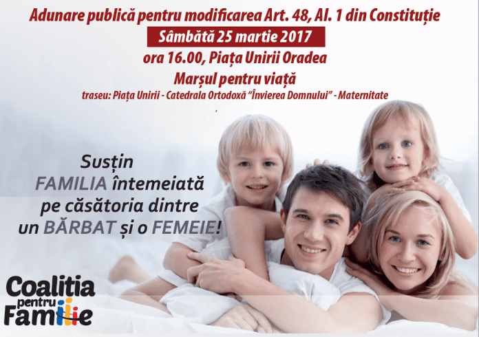 Coaliția pentru Familie susținută de toate Cultele Creștine din România organizează sâmbătă 25 martie 2017, de la ora 16, o Adunare publică în Piața Unirii din Oradea pentru a cere modificarea articolului 48 din Constituția României în sensul definirii familiei astfel: “Familia se întemeiază pe căsătoria liber consimțită între un bărbat și o femeie, pe egalitatea acestora şi pe dreptul şi îndatorirea părinților de a asigura creșterea, educația şi instruirea copiilor.”