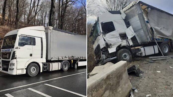În accident sunt implicate două autotrenuri, unul încărcat cu pal și celălalt cu biscuiți.