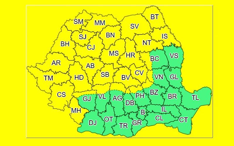 În Banat, Crişana, Transilvania, Maramureş, jumãtatea de nord a Moldovei şi vestul Olteniei, precum şi în zonele montane, gradul de instabilitate atmosfericã se va accentua treptat şi se vor semnala intensificãri puternice ale vântului, cu rafale de peste 60…80 km/h, averse torenţiale, frecvente descãrcãri electrice şi grindinã. În intervale scurte de timp sau prin acumulare, cantitãţile de apã vor depãşi 25 l/mp şi pe arii restrânse 50 l/mp.