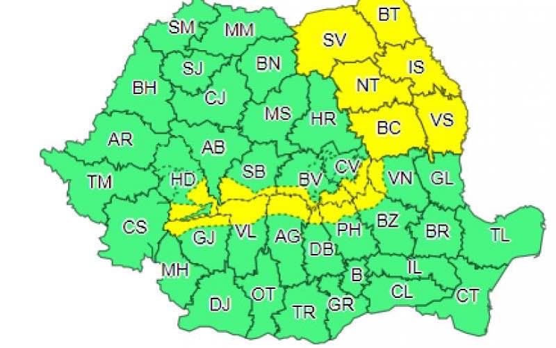 De asemenea, în intervalul vineri ora 22.00 – duminică ora 20.00, judeţele Suceava, Neamţ, Braşov, Covasna, Prahova, Dâmboviţa, Argeş, Vâlcea, Gorj, Sibiu, Hunedoara , Botoşani, Iaşi, Bacău, Vaslui, Vrancea şi Buzău se vor afla sub avertizare cod galben de ninsori însemnate cantitativ şi viscol.