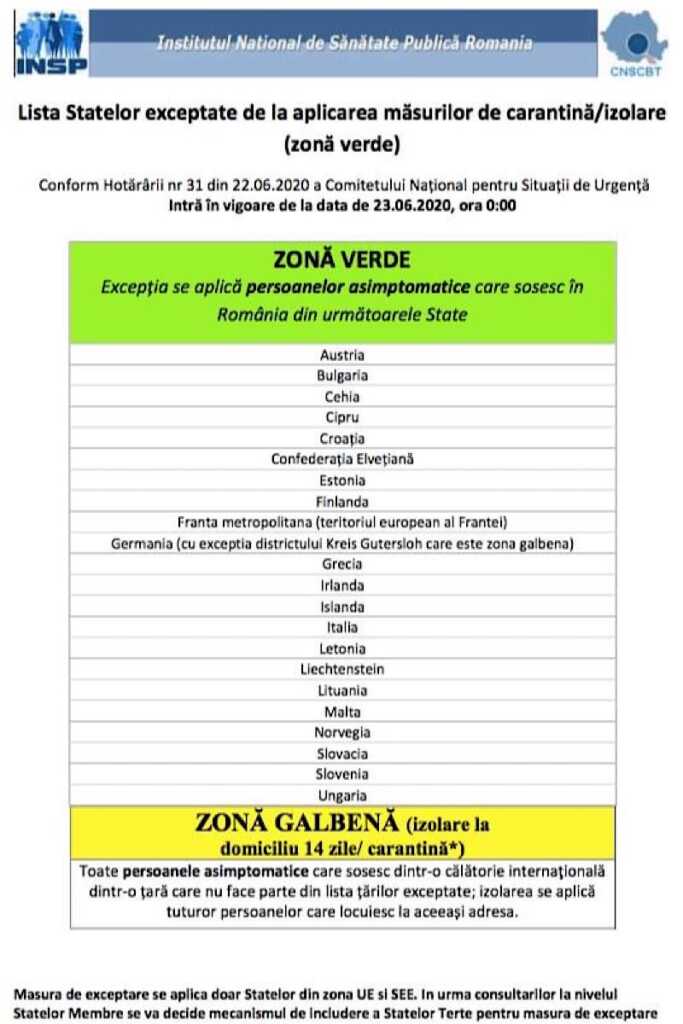 Premierul României, Ludovic Orban, a convocat luni 22 iunie a.c. Comitetul Național pentru Situații de Urgență care a adoptat hotărârea nr. 31 prin care a fost actualizată lista statelor exceptate de la aplicarea măsurilor de carantină/izolare (zonă verde). Excepția se aplică persoanelor asimptomatice care sosesc în România din statele aflate pe listă.
