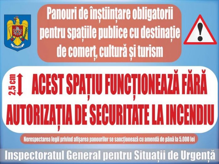 Beneficiarii acestor construcții publice au obligația să realizeze și să amplaseze în dreptul intrărilor panouri de înștiințare, tipărite cu litere de tipar cu dimensiuni de minimum 2,5 cm, de culoare roșie, pe fundal alb, având conținutul: “Acest spațiu funcționează fără autorizația de securitate la incendiu”.