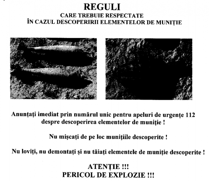 în zona unde se presupune ca ar exista muniţie neexplodata nu permiteţi accesul, nu faceţi focul si nu executaţi lucrări de îmbunătăţiri, săpat.