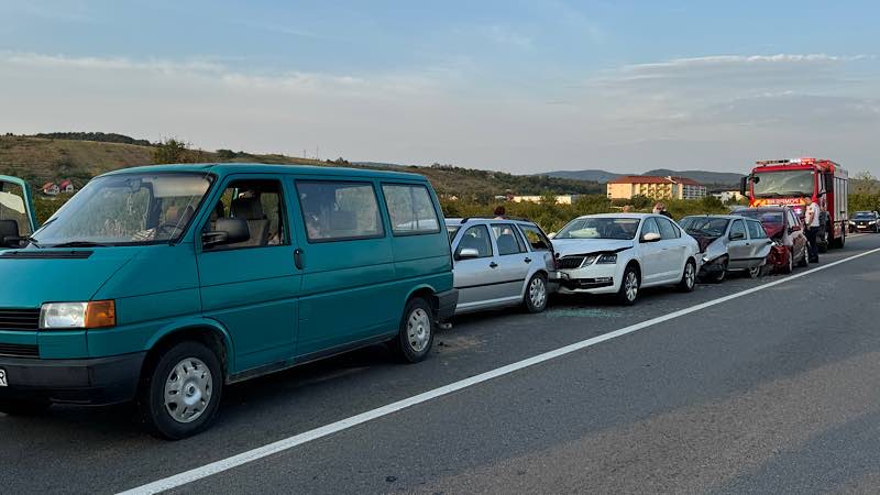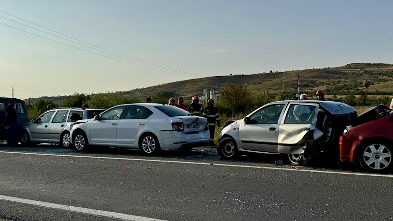 Update: Din investigațiile efectuate de polițiști, s-a constatat că, un bărbat de 31 de ani, din localitatea Tinăud, în timp ce conducea un autoturism înspre Oradea, în împrejurări ce urmează a fi stabilite din cercetări, nu ar fi păstrat o distanță suficientă în mers și ar fi acroșat din spate un autoturism, condus regulamentar, în fața sa, de un tânăr de 23 de ani, din localitatea Lugașu de Jos. Din impact, cel de-al doilea autoturism ar fi fost proiectat în autoturismul care circula în fața sa, iar ulterior, în aceeași modalitate, în accidentul rutier au mai fost implicate alte trei autoturisme, toate acroșate din spate, provocându-se astfel o coliziune în lanț.