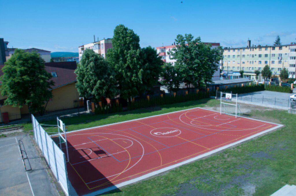 Înainte de reabilitare, liceul avea doar un teren de sport cu o suprafață de asfalt sever deteriorată. Holcim România a construit un al doilea teren de 28mx16m, pe lângă cel existent, pe care a fost turnată șapă de beton, ulterior aplicându-se o suprafață elastică din granule de cauciuc, de tip tartan, permeabilă. De asemenea, s-a refăcut marcajul și s-au instalat porți de handbal și baschet și coșuri de baschet.