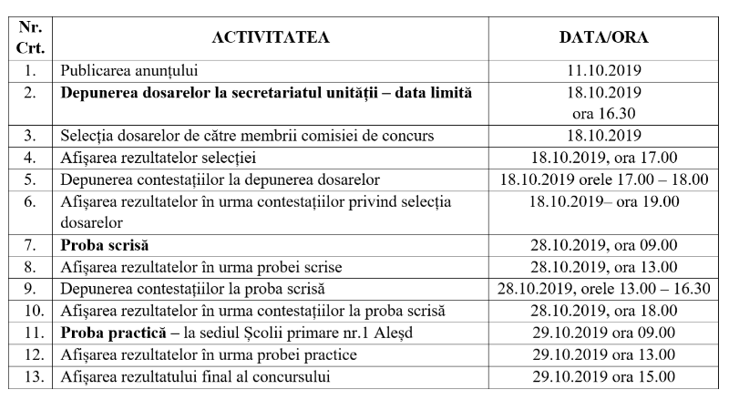 Concursul cuprinde probă scrisă și probă parctică. Proba scrisă se va desfășura la sediul unității școlare, str. Cartier Șoimul, nr. 1 BIS, Aleșd, Bihor în data de 28.10.2019 ora 9.00, iar proba practică la sediul Școlii Primare nr.1 Aleșd, în data de 29.10.2019, ora 9.00.